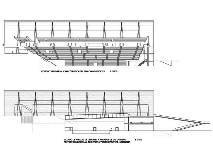 LAS GRANDES LUCES SE CUBREN MEDIANTE VIGAS DE ALMA LLENA, ATIRANTADAS PARA ALIGERARLAS.EL EJE DE LA ACTUACION, NO SOLO FORMALMENTE, SINO TAMBIEN EN CUANTO AL PROGRAMA FUNCIONAL, ES LA GRAN CANCHA PARA LA CELEBRACIÓN DE EVENTOS DEPORTIVOS, CULTURALES Y SOCIALES.ES EL VOLUMEN PRINCIPAL, LA ARENA PROPIAMENTE DICHA. EL ESPACIO BAJO LA PLAZA ALOJA EL CLUB DEPORTIVO Y LAS OFICINAS DE DIRECCIÓN Y GESTION DEL CENTRO, Y EL INSTITUTO MUNICIPAL DE DEPORTES, BAJO EL GRADERIO SUR-OESTE DEL PALACIO.