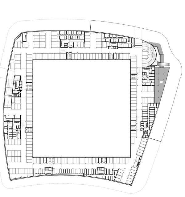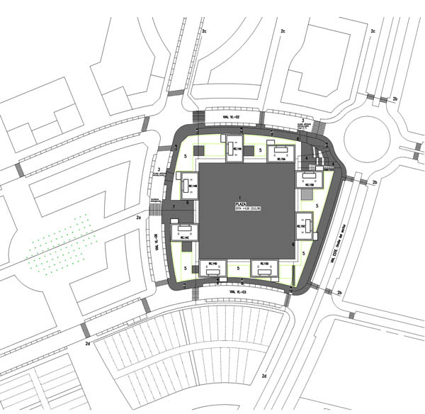 LA PLAZA Y EL FRENTE A CALLE SE CIERRAN CON UN EDIFICIO PERIMETRAL DE UNA ALTURA DE 5 METROS, EL BASAMENTO, QUE ACOGE LOS USOS COMPLEMENTARIOS DE TERCIARIO: COMERCIAL, OFICINAS Y DESPACHOS PROFESIONALES CON ACCESO DIRECTO, Y A VECES A TRAVES DE PATIOS – PLACITAS AJARDINADAS EN LAS QUE VOLCAR TERRAZAS DE BARES Y RESTAURANTES, CREANDO PEQUEÑOS REMANSOS MAS CERRADOS