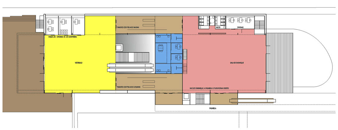 EN UNA PLANTA SUPERIOR SE DISPONE LA SALA VIP, VERDADERO BALCON INTERIOR HACIA VESTIBULO Y EMBARQUE. EN UN FUTURO SE PODRIA OCUPAR MAS PLANTA, CREANDO UNA NUEVA SALA DE EMBARQUE Y DESPLAZANDO LA SALA VIP SOBRE LA TERRAZA MIRADOR