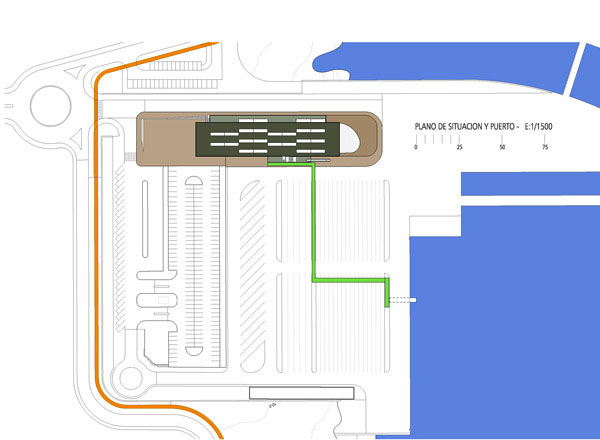 A CONTINUACIÓN, EL VESTIBULO DE ACOGIDA, CON UN GRAN VACIO AL QUE SE ASOCIAN LOS NÚCLEOS DE ESCALERAS Y ASCENSOR, QUE NOS COMUNICA TAMBIEN VISUALMENTE CON LA PLANTA DE LAS TIENDAS Y LA CAFETERIA-RESTAURANTE, ABIERTA AL MAR EN EL OESTE Y EL AREA COMERCIAL TAMBIEN ACCESIBLE DESDE EL NORTE Y DESDE LA PLAYA DE PREEMBARQUE.