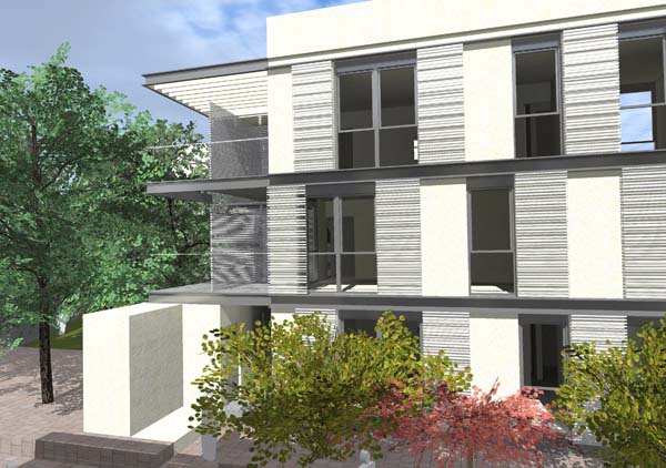 En el elemento transversal se ubica el núcleo de comunicaciones verticales (escalera + ascensor) y los accesos a las viviendas.