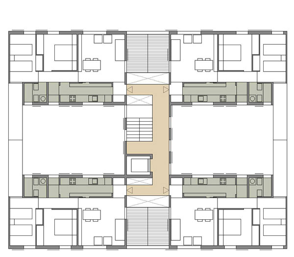 Los huecos se plantean como un “panel especializado”. La carpintería es un compacto listo para montar en obra que incorpora las ventanas, el acristalamiento, el capialzado y el jambeado perimetral. El juego formal de las fachadas principales se establece con el cambio de posición de estos huecos, variable según nivel.