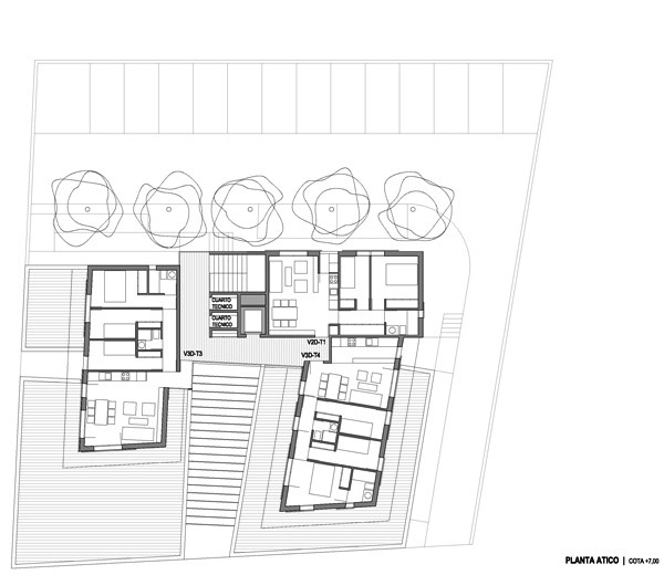 Básicamente en planta, la composición de viviendas sigue una forma en “U” alrededor de un patio-jardín abierto a la calle principal (orientación Este) y dos vacíos menores en los dos laterales (patio-jardín y entrada al edificio). En la zona media de la “U” se sitúa el núcleo de comunicaciones verticales: escalera; ascensor adaptado; patinejo de instalaciones; cuartos técnicos y contadores. Desde él se accede a las viviendas dispuestas cuasi-simétricamente respecto a núcleo y patio-jardín principal.